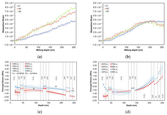 Relaxation strain (with fitting of polynomial function, grade 4) along three directions before heat treatment (examples for radius% = 80%) (a) and after heat treatment (b). Principal residual stress profiles (σ1 and σ2) obtained by considering multiple radius%, (c) before the heat treatment cycle and (d) after the heat treatment cycle. (Dashed lines indicate the different layers of the films, according to the architecture described in Section 2.2).
