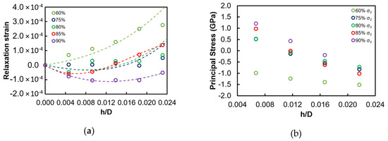 Analysis of the surface residual stress gradient for the sample after heat treatment. (a) Experimental relaxation strain (along one direction, as an example, where dashed lines represent the polynomial interpolation) for different values of radius%; (b) Corresponding residual stress profiles (second principal stress, as an example).
