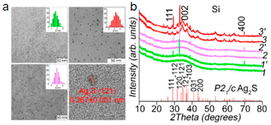 - Sadovnikov, S.I.; Gerasimov, E.Y. "Direct TEM observation of the acanthite α-Ag2S–argentite β-Ag2S” phase transition in a silver sulfide nanoparticle. Nanoscale Adv. 2019, 1, 1581. [Google Scholar] [CrossRef]