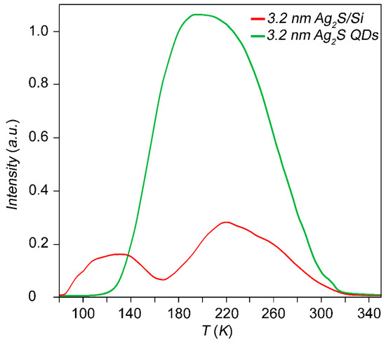 - Perepelitsa, A.; Smirnov, M.; Ovchinnikov, O.; Latyshev, A.; Kotko, A. Thermostimulated luminescence of colloidal Ag2S quantum dots. J. Lumin. 2018, 198, 357–363. [Google Scholar] [CrossRef]