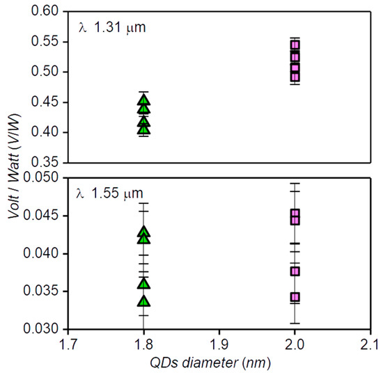 - Wan, Y.; Zhang, Z.; Chao, R.; Norman, J.; Jung, D.; Shang, C.; Li, Q.; Kennedy, M.J.; Liang, D.; Zhang, C.; et al. Monolithically integrated InAs/InGaAs quantum dot photodetectors on silicon substrates. Opt. Express 2017, 25, 27715–27723. [Google Scholar] [CrossRef]