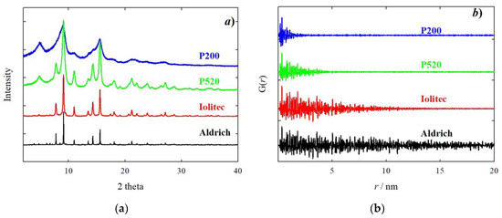 Figure 2b shows the experimental PDF using the HR setup. The decreasing size is evident in the damping of the PDF signal. Considering a negligible instrument effect, the crystal size can be estimated as the r value where the PDF signal goes to zero. Crystal size values can be extracted through a fitting procedure, considering a spherical envelope function [63]. The fits are shown in Figure S11. PDF sizes compare well with WH values (see Table 2), with the PDF providing slightly larger values for specimens P520 (5.4 against 3.8 nm) and Iolitec (13 nm against 11 nm). Examples and discussions of comparisons of crystal size extracted from PDF and different XRPD methods can be found elsewhere [64,65].