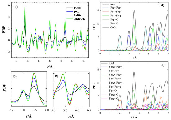 (a–c) Experimental PDF curves in different r ranges. (d,e) Calculated partial PDF according to magnetite (Fd-3m) and maghemite (P4332) structural models, respectively.