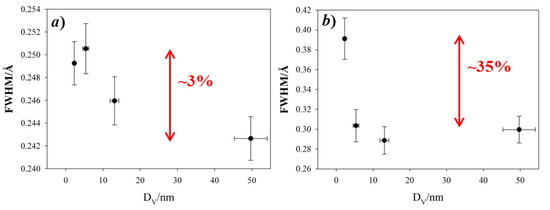 Full width half maximum (FWHM) of PDF peaks at ~3.0 Å (a) and ~3.5 Å (b) is plotted against the crystal size, with reference to the 120 K data collection. The gap of FWHM with respect to specimen Aldrich is highlighted in red.