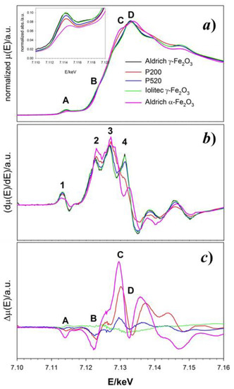The experimental absorption spectra μ(E) of all the maghemite γ-Fe2O3 and a reference hematite α-Fe2O3 samples across the Fe absorption K-edge are shown in Figure 6a. Four absorption peaks appear in the 7.11–7.35 keV range, labeled as A (~7.114 keV), B (~7.122 keV), C (~7.130 keV) and D (~7.133 keV). Near edge features at higher energies will not be considered since they contain more multiple scattering contributions.