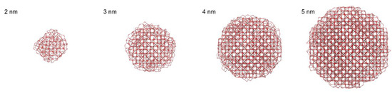 The resulting nanoparticles generated by molecular dynamics are show in Figure 7. The maghemite bulk structure (i.e., the tetrahedral and octahedral sites) can be easily recognized in the large nanoparticles, while in the smaller nanoparticle (2 nm) the maghemite core is largely distorted, due to the large surface to bulk ratio. The shape of the smaller nanoparticles (2 and 3 nm) is roughly spherical, while the larger nanoparticles (4 and 5 nm) display flat facets of the {001} family, and stepped vicinals of the {001} surfaces. Furthermore, the generated nanoparticles display a large number of oxygen ions protruding outside and bridging with two or more iron ions. These bridging oxygens form high-strained small-membered rings. It is conceivable that in presence of moisture, these small-membered rings can break and react with water, forming hydroxyl groups.