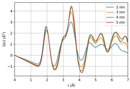 The pair distribution function G(r) of the generated nanoparticles calculated using DiffPy-CMI-2.0 [72] is shown in Figure 8. Considering the very first coordination shells, up to ~4 Å, the trend recalls the experimental PDF. Indeed, whereas the first Fe-O neighbors and octahedral Fe-Fe pairs are nearly unaffected, the plot makes clear that surface relaxation effects can lead to a significant intensity decay of the peak at ~3.5 Å, as the one observed in experimental data (compare with Figure 3). The intensity decrease is about 1/3 compared to the 5-nm nanoparticles, while the next pair at 3.1 Å decreases only by ~15% and being a short distance, this variation cannot be considered as a simple size effect. Surface relaxation obviously contributes significantly to the observed peaks broadening.