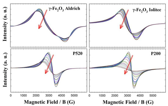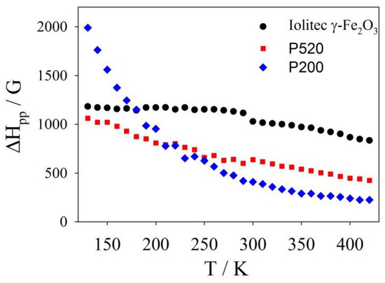 Conversely, the EMR patterns of the Iolitec and P520 samples are composed of single lines, approximately Lorentzian-shaped and narrowing roughly linearly with increasing temperature in the whole temperature range (see Figure 9). The peak-to-peak line-width of the first-derivative spectrum (ΔHpp) is a powerful approach to extract significant information out of EMR spectra [79,80]. The temperature evolution of ΔHpp is shown in Figure 10.