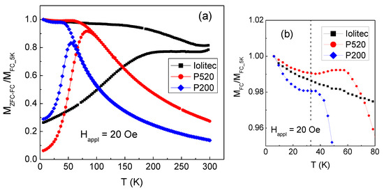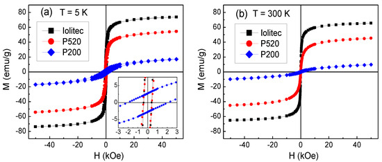 The magnetic properties were studied using a quantum design (Quantum Design Inc., San Diego, CA, USA) superconducting quantum interference device (SQUID) magnetometer operating in the 5–300 K temperature range (maximum magnetic field H =50 kOe). For this kind of analysis, we focused on the P200, P520 and Iolitec samples.