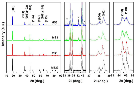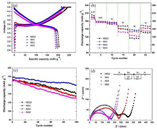 The curves of electrochemical performance are characterized in Figure 5. The initial charge and discharge capacities were tested at 0.1 C rate at room temperature. We can determine from Figure 5a that the initial discharge capacities for the M523, MS1, MS3 and MS5 samples are 203.9, 196.8, 193.7 and 188.0 mAh g−1, and the corresponding coulombic efficiencies are 79.2%, 82.6%, 84.9% and 84.0%, respectively. As discussed previously, a large amount of Sn-doping and Li2SnO3 impurity existed in MS5, which probably led to the lowest initial discharge capacity. The coulombic efficiency values of the Sn-modified samples are all higher than that of the pristine one. This should be attributed to the Sn-substituting, which can relieve the cation mixing degree and is favorable for Li+ transfer.