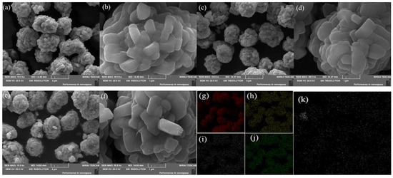 The SEM images of Sn-modified LiNi0.5Co0.2Mn0.3O2 samples and the EDS images are displayed in Figure 2. As is shown, there were no significant differences in the grain sizes from the pristine and Sn-modified samples. All the compounds showed a spherical-like morphology with a particle size from 4 to 6 μm, which is made up by lots of fine primary particles with a length range of 0.5–1 μm. The sample surface was not only compact but also provided enough surface area to make full contact between the cathode and the electrolyte. According to the EDS measurements showing in Figure 2k, it can be obviously seen that stannum and transition metals were uniformly distributed on the surface of the MS3 compound.