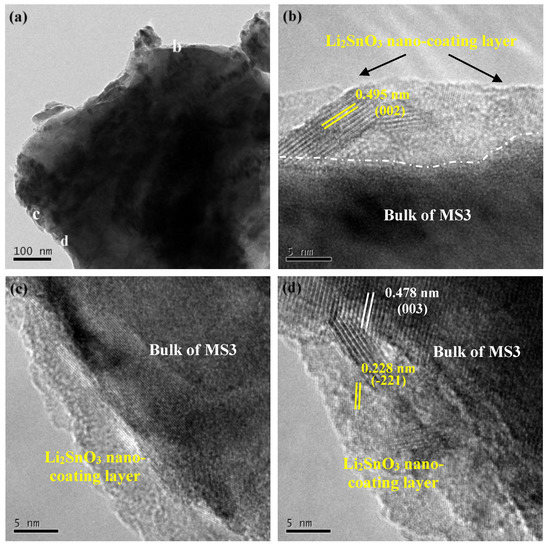 To reveal the in situ formation of the Li2SnO3 on the surface of the samples, the microstructure of Sn-modified LiNi0.5Co0.2Mn0.3O2 sample MS3 was examined using TEM as shown in Figure 3. It can be seen from Figure 3a that a nano-sized coating layer was obtained on the particle surface of MS3. Three of the coating sites (Figure 3b–d) were enlarged in order to observe the thin layer more clearly. The surface coating layer, which uniformly adhered to the bulk of MS3 particles, had a thickness within the range of 5–10 nm. In addition, Figure 3b,c clearly indicates the crystalline interplanar spacing of 0.495 and 0.228 nm, which can be indexed as (002) and (–221) facets of Li2SnO3 (JCPDS no. 31-0761), respectively. The (003) facet of bulk MS3 with the crystalline interplanar spacing of 0.478 nm is demonstrated in Figure 3d. These results were consistent with the XRD result and further identified the formation of Li2SnO3 nano-coating layer.