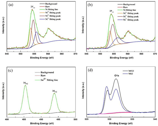 XPS spectra of the synthesized materials: Ni 2p3/2 (a) spectra of M523, Ni 2p3/2 (b), Sn3d (c) spectra of MS3, O1s (d) spectra of M523 and MS3.