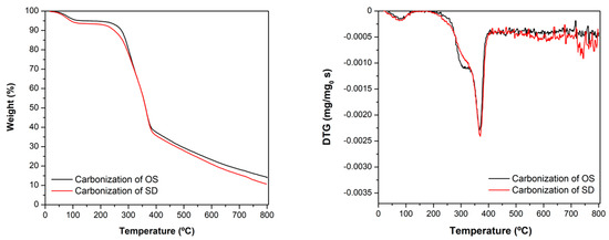 TG-DTG profiles for the carbonization of OS and SD residues.