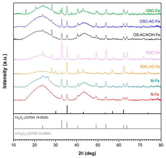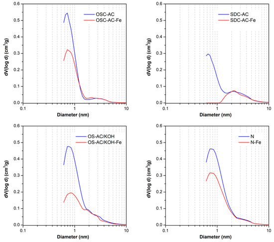 After Fe-impregnation, all catalysts present a smaller porosity than the corresponding supports because Fe-nanoparticles are partially blocking or occupying this porosity (Figure 3). Such blockage affects mainly the microporosity range (which is blocked and not accessible to N2), thus increasing the mean pore size L0 on all catalysts regarding their corresponding supports. Fe-nanoparticles seem to be located mainly on the larger micropores, but the porosity larger than 1.5–2.0 nm is preserved (Figure 3). This fact is corroborated by the strong decrease of W0 values after impregnation of supports with large micropores, particularly for OS-AC/KOH and SDC-AC. Due to the low micropore volume and large micropore size of SDC-AC, microporosity is practically blocked in the obtained SDC-AC-Fe, thus showing the lowest SBET of catalysts derived from activated supports. Consequently, the support’s porous attributes also define the characteristics of the Fe-active phase in the catalysts derivatives. The acid/basic character of the samples is discussed on the basis of their pHpzc values (Table 3). The pHpzc of the supports range from 7.0 to 11.6, being consequently basic materials. However, after impregnation with the Fe-active phase, catalysts become acidic materials.