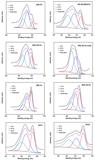 The different high resolution XPS spectral regions (C1s, O1s, and Fe2p) were treated to obtain the surface chemistry composition and results are summarized in Table 4 and Table 5. The Cs1 spectra were fitted using four components [65,66]. The first component at 284.6 eV is used as reference, and is due to aliphatic and aromatic C–C bonds, while the rest of components were assigned to carbon forming oxygen functionalities: single C–O bonds (285.7 eV), double C=O bonds (286.8 eV), and O=C–OH carboxylic structures (288.4 eV). The proportion of carbon linked to oxygen increased from chars to their derivative activated carbons due to the surface oxidation by CO2-treatment (e.g., C–C contribution at 284.6 eV decreased from 71 to 66% in OSC-Fe and OSC-AC-Fe, respectively—Figure S2). The oxygen content (Table 4) also increased but, as previously commented, due to the greater Fe-surface content. The distribution of oxygenated surface groups (OSG) is more clearly pointed out by analyzing the O1s spectral region (Figure 8, Table 5). In this case, three components were used, being the first one located at 530.1 eV and assigned to the Fe–O bonds [67,68], clearly differentiated in the O1s profile by important shoulder at this binding energy that in some cases increased to an independent maximum The other two components located at 531.6 and 533.2 eV are assigned to the OSG on the carbon surface, double C=O and C–O bonds, respectively [65,66]. Broadening of the peak at around 531 eV is suggested to be due to the interactions of the Fe-nanoparticles with the OSG of the carbon supports, forming Fe–O–C bonds [68,69].