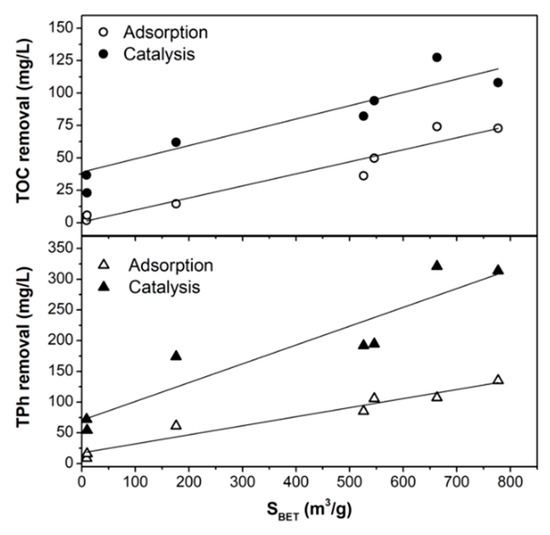 Adsorptive and catalytic screening tests of a polyphenolic solution simulating the OMW showed the importance of the porous structure of the materials, which controls the accessibility of phenolic compounds to Fe-active sites and therefore not only the adsorption capacity of the pollutants, but also the catalytic performance. Both TPh removal and the mineralization degree (TOC) increased linearly with increasing the surface area of the catalysts. Thus, ACs showed an enhanced adsorptive and catalytic behaviors regarding the corresponding biochars.