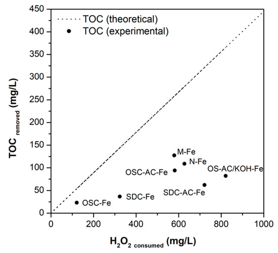 The plot of H2O2 conversion vs. TOC removal shows that OSC-AC-Fe presents one of the highest oxidant use efficiencies (η = 36%) among the catalysts obtained using supports prepared from activated residues (the highest was obtained using OSC-Fe, but mineralization is very low). The performance of this catalyst is similar to those obtained using the commercial support N-Fe (η = 39%) but lower than M-Fe (η = 49%). In comparison, the M-Fe catalyst presents a surface area and surface iron content similar to OS-AC/KOH-Fe, but a narrower microporosity and more heterogeneous Fe-particles distribution. Compared with SDC-AC-Fe, OSC-AC-Fe exhibits a larger surface area but smaller surface iron content (Table 3 and Table 4). Owning to the complexity and diversity of processes occurring simultaneously, but also on the physicochemical heterogeneity among the materials tested, it is virtually impossible to correlate them with all the results obtained. In that sense, the lower H2O2 consumption efficiencies of some materials may be related to the fast scavenging of •OH radicals and/or non-selective decomposition of the oxidant by bulk Fe-oxides and hydroxides, as already reported by other authors [80]. Moreover, it is also well-known the ability of carbon materials to catalytically decompose H2O2 molecules via different routes, even in the absence of any transition metal [81], for which the real yield of •OH radicals generated may vary according to the intrinsic properties of each material.