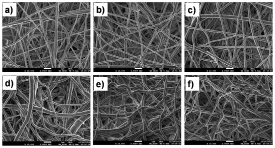 The microstructures of the nanofibers and the deposited plasma polymers were studied by scanning electron microscopy (SEM) using a JSM F7600 (Jeol Ltd., Tokyo, Japan) device. The SEM micrographs were obtained with an accelerating voltage of 2 kV and a scan time of 1 min. In order to compensate for the surface charging, the samples were coated with a ~5 nm thick Pt layer by magnetron sputtering.