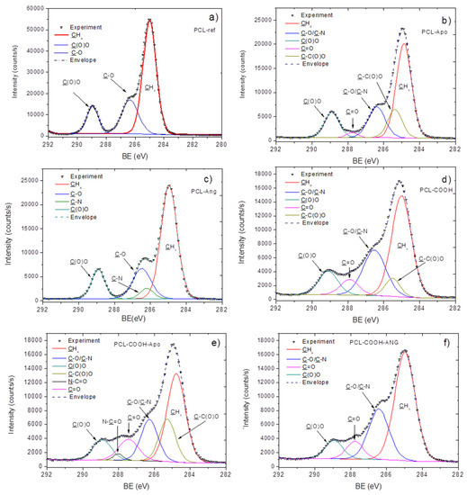 The XPS C1s curve fitting of PCL-ref (a), PCL-Apo (b), PCL-ANG (c), PCL-COOH (d), PCL-COOH-Apo (e), PCL-COOH-ANG (f).