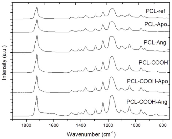In order to more deeply investigate the interaction of proteins with the PCL-ref nanofibers, the FT-IR and XPS high-resolution spectra of samples with immobilized proteins were studied. The XPS C1s spectra of PCL-ref (Figure 2a), PCL-ANG (Figure 2b), and PCL-Apo (Figure 2c) were quite different and they were fitted with different models. PCL-Apo was fitted with a sum of five components: CHx (BE = 285 eV), C-C(O)O(BE = 285.5 eV) C–O/C–N (BE = 286.5 eV), C=O/N–C=O (BE = 287.7 eV), and C(O)O (BE = 288.9 eV). The PCL-ANG was fitted with the sum of four components: CHx (BE = 285 eV), C–N (BE = 286.2 eV), C–O (BE = 286.5 eV), and C(O)O (BE = 288.9 eV). The full width at half maximum (FWHM) value for all components was set to 1.1 ± 0.1 eV. The XPS C1s spectra of PCL-Apo and PCL-ANG are presented in Figure 2b,c. Although certain changes in carbon environments are evident, it is not possible to quantify the density of the immobilized proteins. The comparison of FT-IR spectra of PCL-ref, PCL-Apo, and PCL-ANG (Figure 3) did not reveal significant differences after the immobilization. As for the nitrogen environment, the XPS N1s curve fitting of all samples revealed that nitrogen consists mainly of the amide environment (N–C=O), because the N1s signal can be fitted with only one component at ~399.9 eV, as shown in Figure S3. Indeed, for the proteins containing many peptide bonds, this observation is very consistent with expectations, although it is not very informative. On the other hand, the semi-quantitative information can still be extracted from the data via a careful analysis of the XPS data, which will be presented in Section 3.4, opening a door leading to a new series of protein–surface interaction investigations