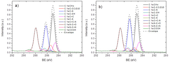 The chemical composition of the sample surfaces was determined by the X-ray photoelectron spectroscopy (XPS) using an Axis Supra spectrometer (Kratos Analytical, Manchester, UK) equipped with a monochromatic Al Kα X-ray source. The maximum lateral resolution of the analyzed area was 0.7 mm. The spectra were fitted using the CasaXPS software after subtracting the Shirley-type background. The binding energies (BE) for all carbon and nitrogen environments were taken from the literature [24,25,28]. The BE scale was calibrated by setting the CHx component at 285 eV.