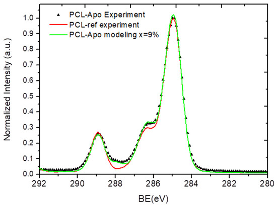 A comparison of the XPS C1s spectra: the experimentally measured PCL-Apo (PCL-Apo-Experiment), PCL-ref, and calculated PCL-Apo (PCL-Apo-modeling).