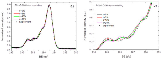 A comparison of the XPS C1s signals for PCL-COOH-Apo, which were measured experimentally and modeled with the different concentrations of protein (x) on the surface. An overview (a) and an enlarged image of the spectrum (b) are given to better show the effect of x on the similarity of the calculated spectrum to the experimental data.