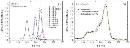 In order to confirm the applicability of the proposed methodology for modeling of protein spectra and the quantification of the immobilized proteins with the XPS data, we decided to apply our methodology towards the most thoroughly analyzed protein, namely fibronectin (FN). The spectrum of fibronectin was calculated using the aforementioned methodology and is presented in Figure 8a. The modeled FN and the experimentally measured PCL-COOH-FN spectra are shown in Figure 8b.