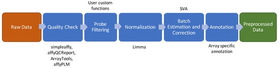The current standard of a microarray data preprocessing pipeline is shown in Figure 1 and comprises the following steps: quality check, probe prefiltering, normalization, batch effect and surrogate variables estimation and correction [15]. A complete list of all the methods and R packages used to implement this pipeline is shown in Table S1.