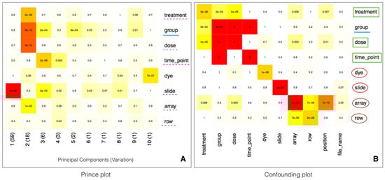 A fundamental step in the analysis is to attenuate the effects associated with batch variables while retaining the variation associated with biological variables. As previously discussed, to be able to properly correct the batch effects, the experimental design, including sample randomization and proper metadata annotation, needs to be carefully considered. Batch estimation and correction can be performed by using the surrogate variable analysis (SVA) R library [29]. Known biological (e.g., treatment, disease status, age, tissue) and technical (e.g., dye, array) variables are in general provided by the user in the phenotypic information, while unknown sources of variation can also be identified through the surrogate variable analysis [29]. The impact of the technical variables on the expression values can be identified by means of the prince plot (Figure 2A), that shows the correlation between the variables and the principal components of the expression matrix. In fact, the prince plot is a visualization of the output of Principal Components Analysis (PCA), which is a popular and powerful method to quantify the effect of batch variables, as well as to reveal the presence of unaddressed sources of batch behaviour in the data [30]. Moreover, the correlation between both biological and technical variables can be visually evaluated by the confounding plot (Figure 2B). This information is used to identify batch variables as known technical or surrogate variables which are associated with strong sources of variation and are not correlated with biological variables of interest.