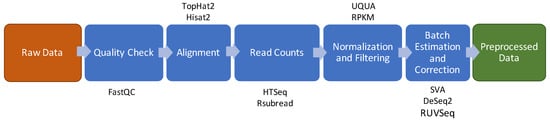The state of the art of a typical RNA-Seq preprocessing pipeline is shown in Figure 3 and comprises the following steps: quality check, reads alignment, raw counts extraction, counts normalization and filtering and batch effect estimation and correction [10]. A complete list of all the methods and R packages used to implement this pipeline is shown in Table S3.