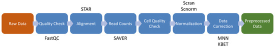 scRNA-seq technologies became more widespread and provided unprecedented opportunities for exploring gene expression profiles at single cell resolution, which greatly revolutionizes transcriptomic studies. Since the first publication about scRNA-seq methodology in 2009 [65], a number of scRNA-seq data analysis tools have been developed [66], that are available as scRNA-tools database (www.scRNA-tools.org) [67]. Nonetheless, the golden standard pipelines have not yet been established due to the technical noise, biological variation, the growing number of analysis methods and exploding data set sizes. Although some pipelines, such as Cell Ranger [68], inDrops [69], SEQC [70] and zUMIs [71] were proposed for the analysis of scRNA-seq data, they remain unexploited in most of the cases. In the sections below, we will discuss currently available methods for data preprocessing and analysis of scRNA-seq data. The common pipeline of scRNA-seq preprocessing is shown in Figure 4, which comprises the following steps: quality check on raw sequencing data, alignment, read counts extraction, cell quality check, normalization and data correction.