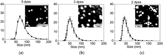 Below, we present the results of the syntheses of Star-dots, which encapsulated five (C504, R560, R6G, R640, and NB), three (FITC, RB, and NB), and two (R6G and RB) different fluorescent dyes. The dye molecules were physically coupled by FRET to transfer their excitation energy from the donor to the acceptor dye. The nature of a particular encapsulated dye showed little influence on the nanostructure of the particles [31]. Figure 1 shows the particle size distribution obtained with the DLS technique (see also Table S1 of the Supplementary Materials). The inserts show the AFM images of the particles dispersed on a glass slide. The AFM images are intended to show the mostly roundish geometry of the particles of approximately the same size as measured by DLS. One can see that the particle size was very weakly dependent on the encapsulated dyes. Furthermore, based on the FRET observed here and high quantum yield (see below), we can conclude that the use of multiple dyes for encapsulation did not noticeably influence the geometry of Star-dots.