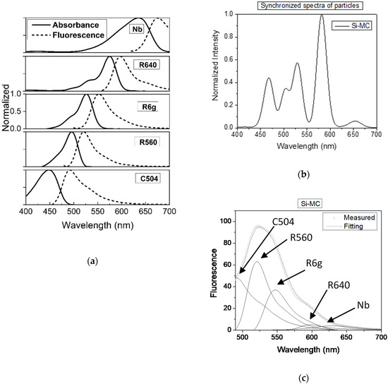 Figure 2 shows the case of encapsulation of five dyes inside of Star-dots: C504, R560, R6G, R640, and NB. Figure 2a shows the absorption and emission spectra of each dye. The overlap between the emission of donor and absorbance of acceptor dyes, which are clearly seen in this figure, yielded a FRET cascade in fluorescence excitation/emission within each particle. Figure 2b demonstrates a fluorescence spectrum in which the excitation wavelength was moved between 400 and 700 nm, while the emission was measured at the wavelengths of the excitation plus 10 nm (synchronized spectrum). In this way, one could clearly see the presence of individual dye molecules encapsulated in particles. Finally, Figure 2c shows the fluorescence spectrum of Star-dots excited at 480 nm. The Star-dots yielded a fluorescence spectrum spanning from 470 to 700 nm. The decomposition of the obtained spectrum onto the contribution from individual dyes (fluorescence spectrum was recorded for water solution of dyes) is also shown. One can see that the linear mixing of the contributed dyes matched rather well with the measured fluorescence spectrum.