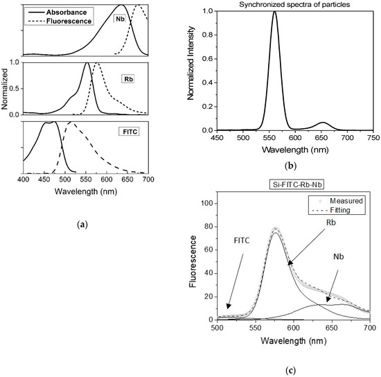 Figure 3 shows the case of encapsulation of three dyes inside of Star-dots, FITC, RB, and NB dyes. Figure 3a shows the absorption and emission spectra of each dye used for encapsulation in these Star-dots. One can clearly see the overlap between the emission of donor and absorbance of acceptor dyes, which yielded the FRET cascade in fluorescence excitation/emission within each particle. Figure 3b demonstrates a fluorescence spectrum in which excitation was scanned between 400 and 700 nm, and the emission was measured at the wavelengths of the excitation plus 10 nm (synchronized spectrum). One can clearly see the presence of individual dye molecules encapsulated in particles, although the presence of FITC was almost hidden due to the efficient FRET coupling with RB dye. This coupling can be seen in Figure 3c, which shows the fluorescence spectrum of Star-dots excited at 488 nm. One can see that virtually all FITC absorbed energy was transferred to the excitation of RB dye, which in turn, shared its excitation with NB dye.