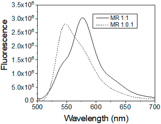 Now we demonstrated an example of encapsulation of two different dyes, R6G and RB, which were encapsulated inside of the particles in two different proportions. Absorption/fluorescence spectra of these dyes are already shown in Figure 2 and Figure 3. Figure 4 shows the fluorescent spectra of two different proportions of these dyes with molar ratios of R6G:RB of 1:1 and 1:0.1. The fluorescence spectra were excited with a wavelength of 488 nm. One can see the spectra were entirely overlapping. Nevertheless, as we show later, these spectra could be demultiplexed with a rather small error.
