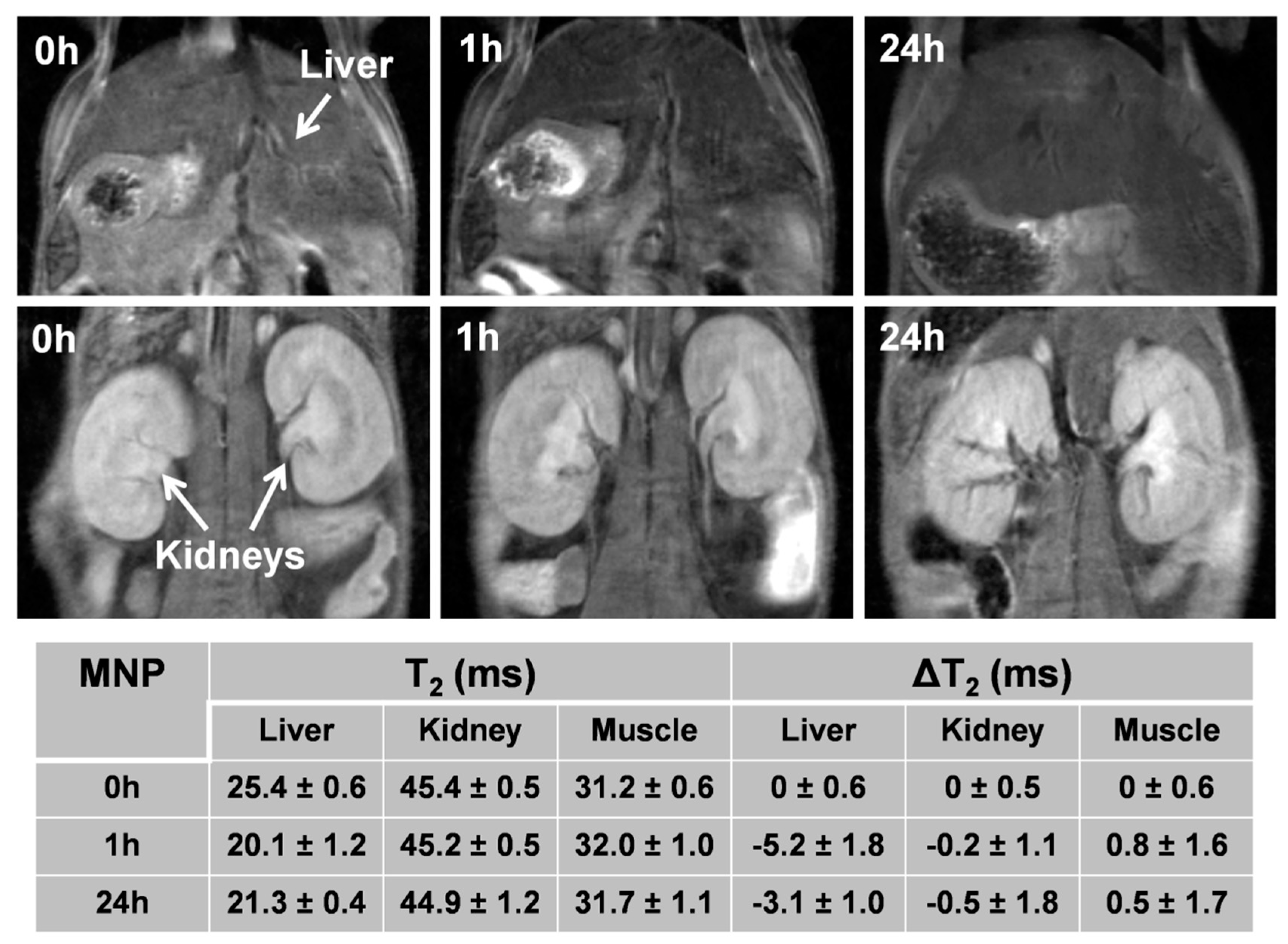 - Pernia Leal, M.; Munoz-Hernandez, C.; Berry, C.C.; Garcia-Martin, M. In vivo pharmacokinetics of T2 contrast agents based on iron oxide nanoparticles: Optimization of blood circulation times. RSC Adv. 2015, 5, 76883–76891. [Google Scholar] [CrossRef]