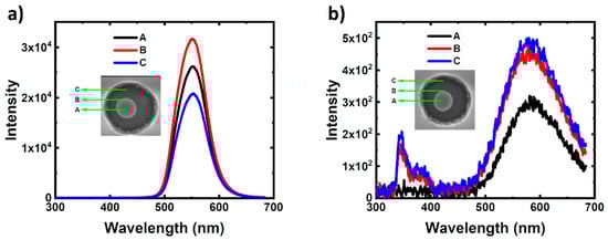 CL spectra measured at Points A, B, and C for (a) the Ag–PhC/QW sample and (b) Ag–PhC/woQW sample. Their insets show the measurement points in the SEM images.