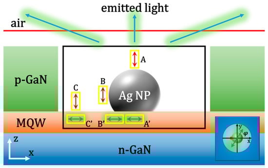 where and are the real parts of the dielectric constants of the semiconductor and metal. For GaN and Ag, can be calculated as about 50 nm, indicating that the LSP-e-beam or LSP–QW coupling is weak at Point C. Therefore, the CL intensity at Point C is less than that at Point A in Figure 2a. As to the CL spectra at Point B, the CL intensity is strongest in Figure 2a. The CL enhancement may be due to the more LEE at the edge of the Ag NP since the light from the QWs is less sheltered. It will be discussed in the following FDTD simulations. In Figure 2b, since the CL enhancement by LSP coupling with radiators is small, the LEE enhancement at Point B cannot surpass the energy loss in the metal. In short, the coupling strength of LSP with the radiators may correspond to the intrinsic efficiency of the radiator and coupling conditions. The YL and GaN band edge radiators show less coupling strength to LSP than the QWs do. Generally the emission from InGaN QWs is two orders stronger than that from GaN bulk material under the same injection level.