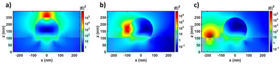 The electrical field profiles at 551 nm on the x–z plane when placing the z-dipoles at Points (a) A, (b) B, and (c) C. All the simulations are run with the aspect factor k = 1.67 and without the q-dipoles added.