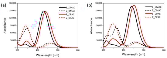 In this study, two D–π–A organic dyes were designed containing two electron-donating moieties, namely, dimethylamine and diphenylamine, an azobenzene-benzene moiety as the π-spacer, and cyanoacrylic acid as the anchoring group, as shown in Figure 1. The azo group, which showed reversible cis-trans photoisomerization and allowed geometrical change of the π-conjugation backbone under light and heat, led to the trans and cis structures of the two studied dyes (Figure 1b). In this study, the trans structures are named E-DMAC and E-DPAC and the cis structures are named Z-DMAC and Z-DPAC. Here, DMAC and DPAC contained methyl and phenyl moieties in their donor moieties, respectively. To provide more realistic information about the dye adsorption on the semiconductor surface in terms of electronic structure and optical properties, the dyes adsorbed on the TiO2 surface were also studied and are referred to as dye/TiO2 in this study. Figure 1c shows the optimized structures of the dye/TiO2 complexes for both dyes. In the dye/TiO2 complexes, the adsorption of dyes through carboxylic acid can occur via either physisorption or chemisorption. The carboxylic acid can bind to the TiO2 surface by several anchoring modes, such as monodentate bridging, bidentate bridging, and bidentate chelating [25,26]. Because of the controversies surrounding the exact anchoring modes for the binding of dyes on TiO2 nanoparticles, the studied dyes were optimized considering all the three anchoring modes, and the findings revealed that the bidentate chelating anchoring mode was the most stable form for these dyes for both the cis and trans isomers. To simulate the dye/TiO2 complexes, the initial geometry of the (TiO2)9 anatase cluster was obtained from the previous study [26], which was large enough to reproduce the electronic and optical properties of the nanocomposites [27].