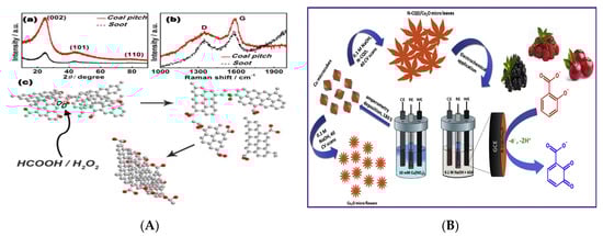 (A) Schematic of synthesis and characterization of CQDs by chemical oxidation (a: X-ray diffraction (XRD) patterns; b: Raman spectra; c: formation schematic of CQDs). Reproduced with permission from []. Copyright Chemical Communications, 2017; (B) Schematic of electrochemical preparation of N-CQDs/Cu2O and ASA detection in berries. Reproduced with permission from []. Copyright Journal of Colloid and Interface Science, 2018.