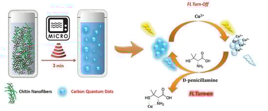 Figure 3 shows the synthesis process of CQDs (Size: 2–10 nm, QY: 5.1%) from chitin nanofibers using microwave assisted-hydrothermal method in 3 min and “on-off” transformation of CQDs-Cu2+ for the drug sensing based on quenching effect []. The fabricated CQDs exhibits high stability and sensitive and selective fluorescent to D-penicillamine. Zhang et al. synthesized N, S doped CQDs (NS-CQDs) with an average diameter of 3.3 nm by microwave-assisted treatment of vitamin C and thiourea, which had a red shift in the wavelength range of 280–400 nm, resulting from the electromagnetic waves formed by the surface functional groups []. Compared with ordinary CQDs, the doped atoms not only adjust the surface energy and electron energy of CQDs but also improve the physical and chemical properties of CQDs and its selectivity to the target molecules [,]. By optimizing the experimental conditions and comparing the cross-linking degree of different hydroxy compounds (propanol, 1,2-propanediol, glycerin), Feng et al. finally obtained N-CQDs (Size: 2.8 nm, QY: 27.9%) by microwave heating of 2-azidazole and glycerin []. This research verified the close correlation of fluorescent QY and chemical natures of cross-linked internal core, which offered the theoretical foundation to design adjustable luminous probes with high QY. Based on the static quenching effect, the prepared N-CQDs was further successfully used as a “turn-off” fluorescent nanoprobe for the detection of Ag+. Judging from the previous reports, microwave heating is a fascinating and promising tool for the preparation of carbon materials, especially for CQDs with small-size [,,]. The approach of microwave-assisted has become one of the commonly used and indispensable methods of the CQDs synthesis because of the characteristics of time and energy saving, controllable operation, no requirement for complex equipment and so on.