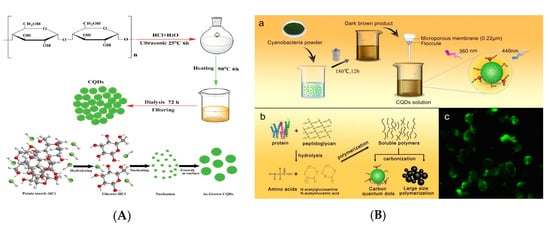 (A) Schematic of the ultrasound-assisted synthesis and the formation mechanism of CQDs. Reproduced with permission from []. Copyright New Journal of Chemistry, 2019; (B) Schematic of the hydrothermal synthesis of CQDs (a: synthesis routes of CQDs; b: formation mechanism of CQDs; c: fluorescent cell imaging). Reproduced with permission from []. Copyright Polymers, 2019.