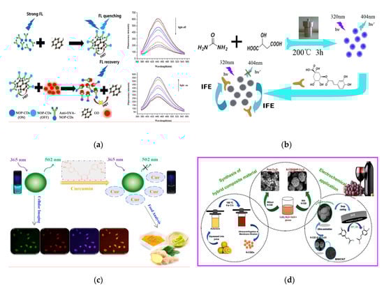 The content of ovalbumin (OVA) is deemed as a reference for evaluating the quality of protein []. Fu et al. synthesized a novel CQDs co-doped with N, O, P (NOP-CQDs) through one-step hydrothermal method and applied for quantitative detection of OVA in the egg products [] (Figure 5a). In the fluorescent resonance energy transfer (FRET) system composed of NOP-CQDs, graphene oxide and anti-OVA, the “on-off” sensing probe has achieved the selective recognition and capture of OVA based on the specific interaction of antigen-antibody, which achieved a limit of detection (LOD) of 153 µg L−1. Purbia et al. developed a highly luminescent CQDs (Size: 1–6 nm) with green and blue fluorescent for detecting vitamin B1 in commercial vitamin capsule (LOD: 280 nmol L−1) []. The detection principle is that the gradual addition of vitamin B1 can restore the fluorescent of CQDs quenched by Cu2+, thereby achieving the rapid detection of targeted component. Certain small molecular substances present in plant-derived foods have specific antibacterial, anti-inflammatory or anti-oxidant properties, which gives the foods special medicinal properties. These small molecules are defined as “functional components” and this kind of foods is called “medicine-homologous foods” [,]. Qualitative or quantitative analysis of the functional components in medicinal-homologous foods is usually the main method to evaluate their quality. Fluorescent CQDs provides an effective, convenient and accurate strategy for the analysis and detection of such efficacy components. Chlorogenic acid has remarkable antibacterial and antiviral pharmacological effects, the amount of which is the main basis for evaluating the quality of honeysuckle (a medicinal-homologous food). Yang et al. synthesized the water-soluble CQDs (Size: 2.1 nm, QY: 16.5%) via hydrothermal treatment of malic acid and urea and applied for the fluorescent sensing detection of chlorogenic acid in honeysuckle [] (Figure 5b). Due to the mechanism of IFE [], the fluorescent of CQDs is effectively quenched as the concentration of chlorogenic acid increases in the linear range of 0.15–60 µmol L−1, with a lower LOD of 45 nmol L−1. By comparison with the HPLC and HPLC-MS/MS for chlorogenic acid detection [,], the developed CQDs-based method not only has good improvement on the sensitivity but also significantly improves the detection speed, which is suitable for rapid screening of large quantities of honeysuckle samples. Curcumin (Cur) is an acidic polyphenolic substance extracted from the roots of ginger plants and its main chain is unsaturated aliphatic and aromatic groups. As a yellow pigment, it is often used as a meat coloring agent and acid-base indicator and has anti-inflammatory, antioxidant and other pharmacological effects [,]. Liu et al. have rapidly synthesized one N and P dual-doped CQDs (NP-CQDs) using glucose as carbon source, 1,2-ethylenediamine as N-dopant and concentrated phosphoric acid as P-dopant, which was further utilized as a label-free sensor for Cur determination [] (Figure 5c), achieving a linear range of 0.5–20 µmol L−1 and a LOD of 58 nmol L−1. In practical samples (drinking water and foods), satisfactory relative standard deviations (RSD) and recoveries were 0.08–5.39% and 95.2–105.2%, respectively. Additionally, this NP-CQDs can be used as effective fluorescent agent for cellular imaging without noticeable cytotoxicity.