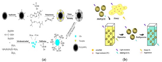 (a) Schematic of the preparation of core-shell magnetic molecularly-imprinted microspheres (MMIPs) of vinyl phosphate (VPA)-functionalized CQDs (MMIPs-CQDs@VPA) and the detection process for triazophos. Reproduced with permission from []. Copyright Polymers, 2019; (b) Schematic of fluorescent detection process of tetracycline (TC) in honey. Reproduced with permission from []. Copyright Talanta, 2018.
