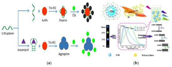 (a) Schematic of the fluorescent aptasensor for acetamiprid detection based on AuNPs and CQDs. Reproduced with permission from []. Copyright Analyst, 2018; (b) Schematic of three TCs for visual detection using CQDs-based test strips. Reproduced with permission from []. Copyright Nanoscale, 2018.