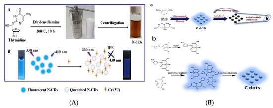 (A) Schematic of the detection of Cr6+ by N-CQDs fluorescent sensor. Reproduced with permission from []. Copyright Spectrochimica Acta Part A-molecular and Biomolecular Spectroscopy, 2019; (B) Schematic of the CQDs for the detection of Cr2O72− (a: the detection mechanism of Cr2O72−; b: the synthesis route of CQDs). Reproduced with permission from []. Copyright Dyes and Pigments, 2019.