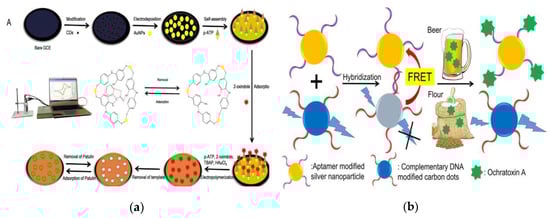 (a) Schematic of the preparation process of MIP-Au/CS-CQDs/GCE on glassy carbon electrode (GCE) and the detection of patulin. Reproduced with permission from []. Copyright Biosensors & Bioelectronics, 2017; (b) Schematic of fluorescent detection of ochratoxin A (OTA) in beer and flour based on FRET. Reproduced with permission from []. Copyright Talanta, 2018.